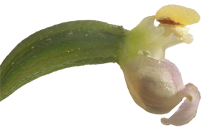 Griffelsøylen og leppen i en breiflangreblomst. Resten av blomsterdekket er fjernet.